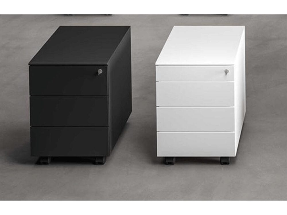 - Metal Pedestal: Structure made of epoxy powder painted steel plate th 0,8/1/2mm. All edges are rounded with a bending radius of 4mm. Drawer fronts are shaped creating side handle opening and On Castors.