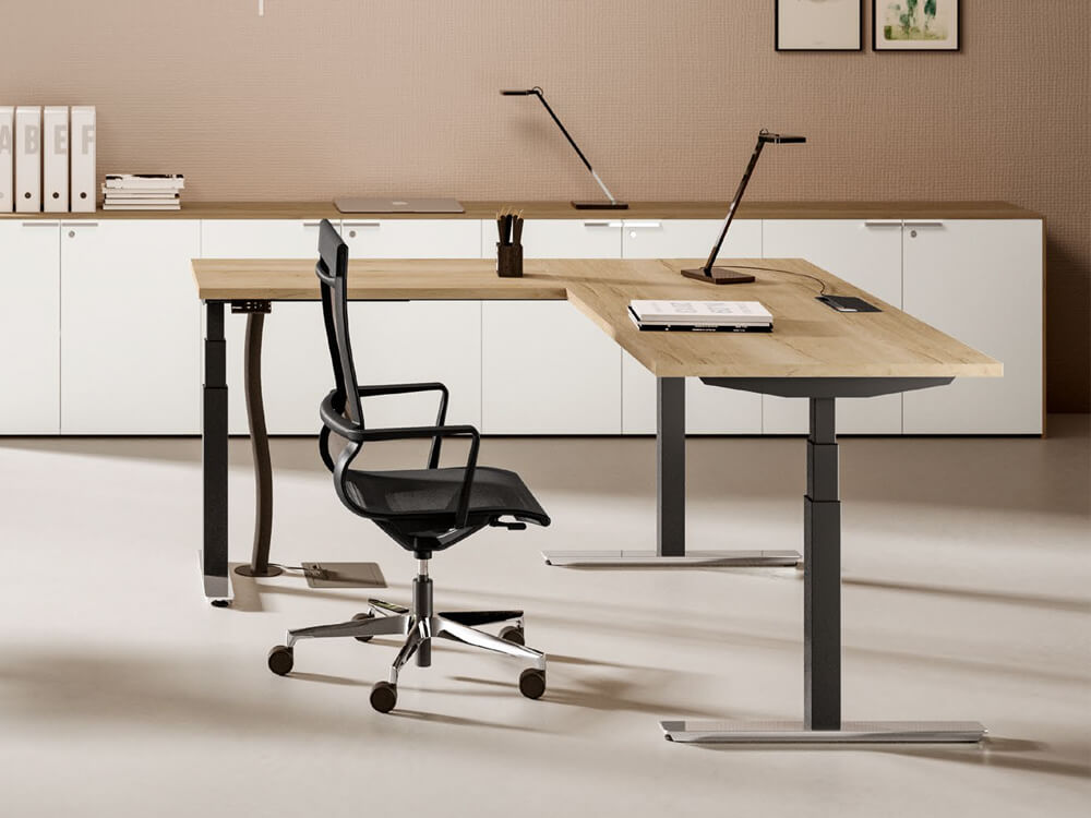 The Italian designed height adjustable desk allows the freedom to sit or stand during long working hours. The electric structure is controlled by a standard height adjustment button with a fixed position between 650 mm and 850 mm.