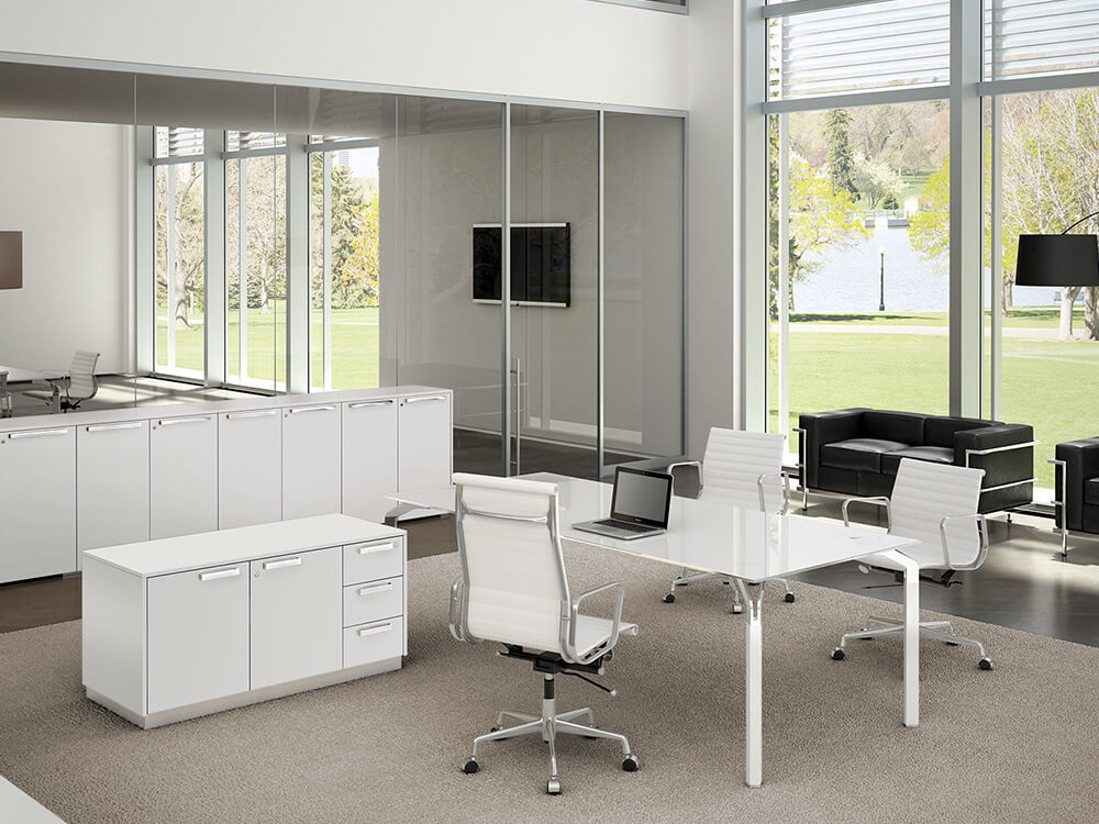 Vinny 1 – Executive Desk with Lacquered Glass Top and Optional Return & Credenza Unit
