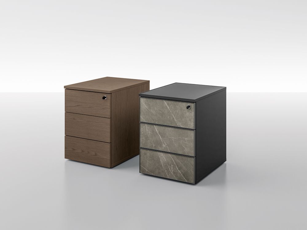 - Pedestal Drawer Structure: Drawer interior made with sides covered in black pvc and bottom in 3mm thick mdf. Also available in the version with metal drawer structure. Opening system with sliding on retractable square guides, with Push & Pull mechanism, including centralized lock provided with double numbered and accident prevention folding key.