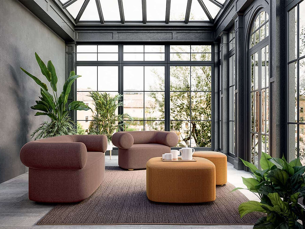 - An armchair, sofa and pouf available in two different sizes feature crafted details and stitching. This collection is ideal for several environments: waiting rooms, relaxation areas in dynamic offices, a cosy living room or a metropolitan lounge bar. These are original, cosy items that promote conversation and the art of hospitality