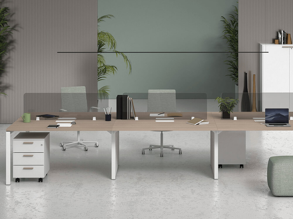 - Worktop: 25mm melamine-faced chipboard tops with 2mm ABS edges, low-emission, fire-rated. Securely mounted with clips and brackets; cable accessories optional.